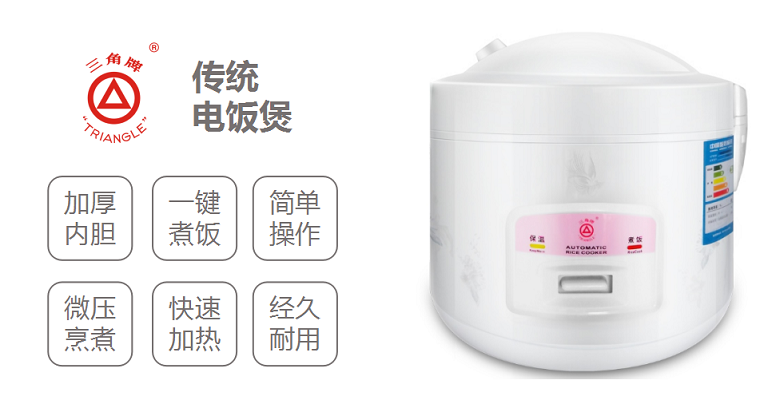 Founded in 1963, the brand Triangle is mainly specialized in the rice cookers production. Its products are sold to Southeast Asia and have been reputed all time. For 50 years, the brand has been committed to providing consumers with reliable and affordable electric appliances relying on its classic producing processes and unremitting innovation. It has extended from the field of rice cooker to all kitchen appliances other household electric appliance. The products are sold both domestic and overseas. So far, Triangle products include rice cooker, electric kettle, electric pressure cooker, non-electric pressure cooker, electromagnetic oven, smoke exhaust ventilator, cooking utensils, water heater, fridge, commercial kitchen equipment and air cleaner, with an annual output and sales volume of over 10 million sets. Some products secure top position in terms of sales volume in the domestic market. It has become a China Well-known Trademark, a Guangzhou famous trademark and a Guangzhou Time-honored Brand.
